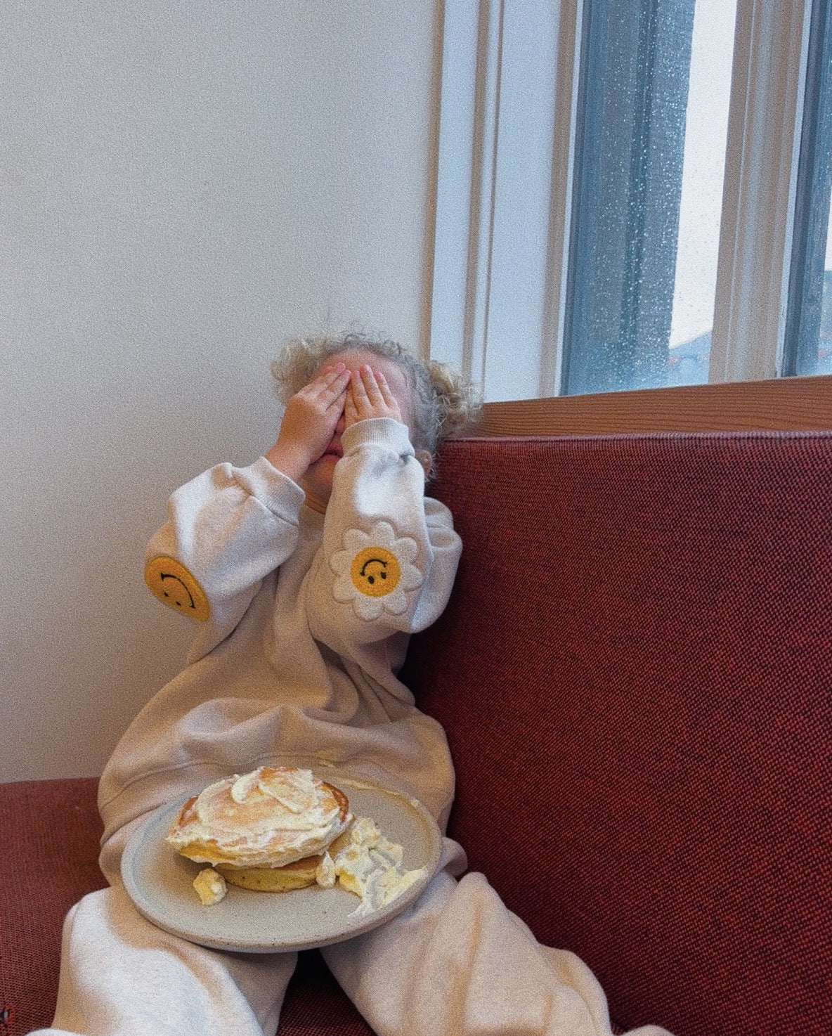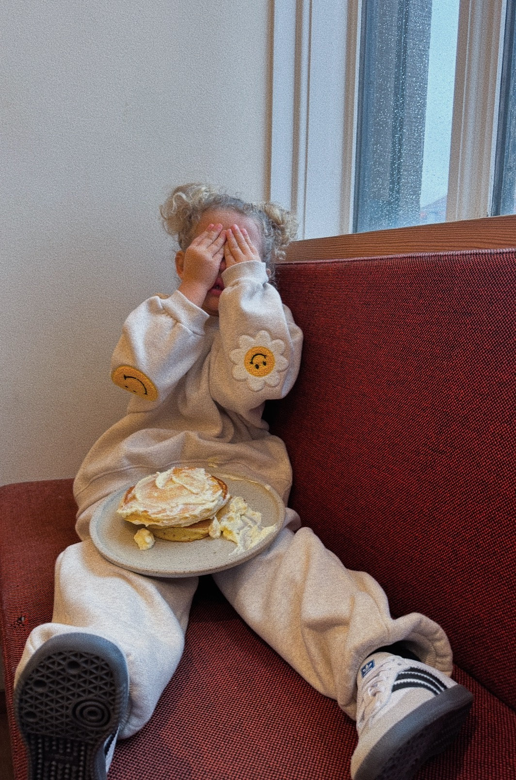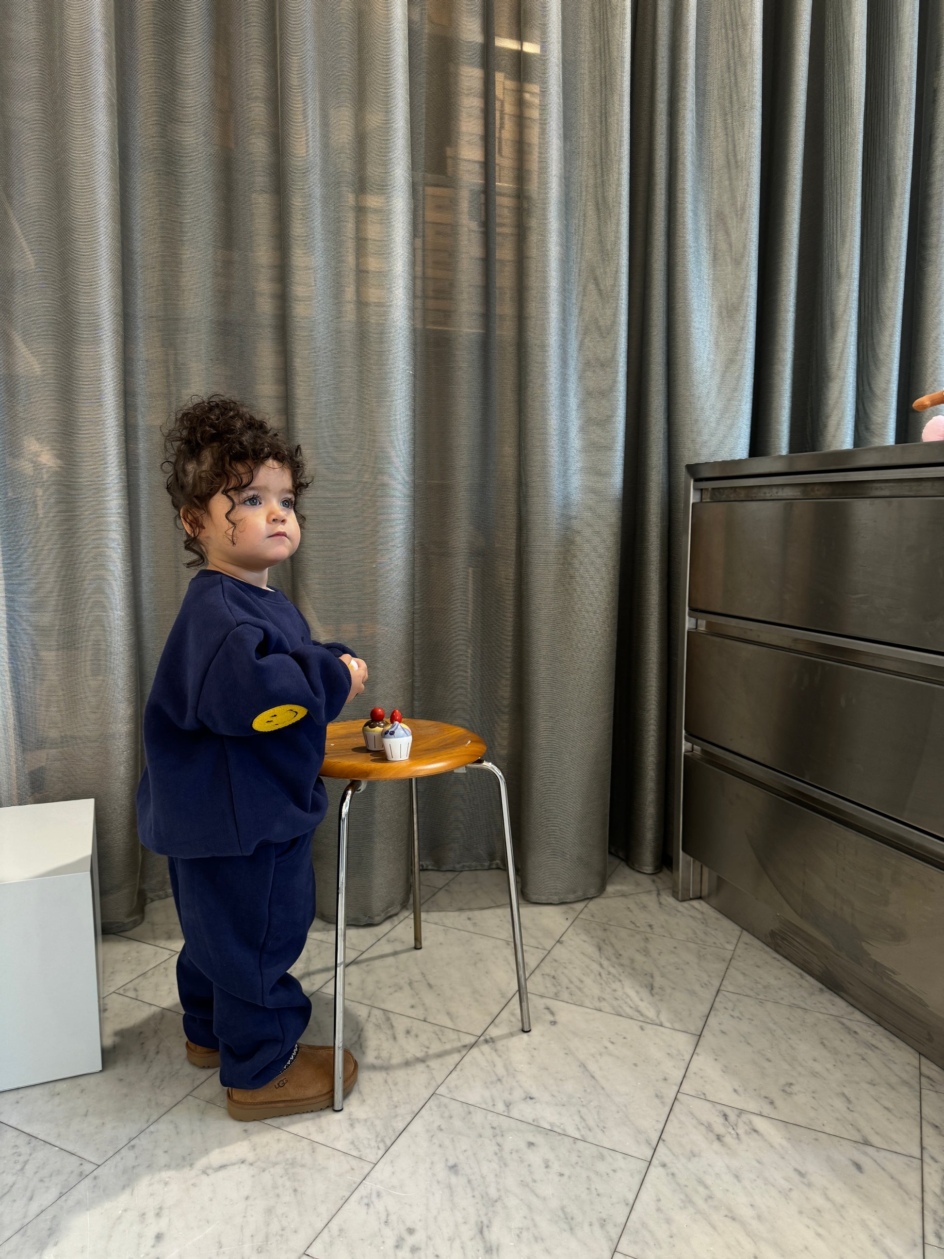 Super soft and thick sweatset (top & bottom) in 100% cotton with trendy smiley elbow patches.