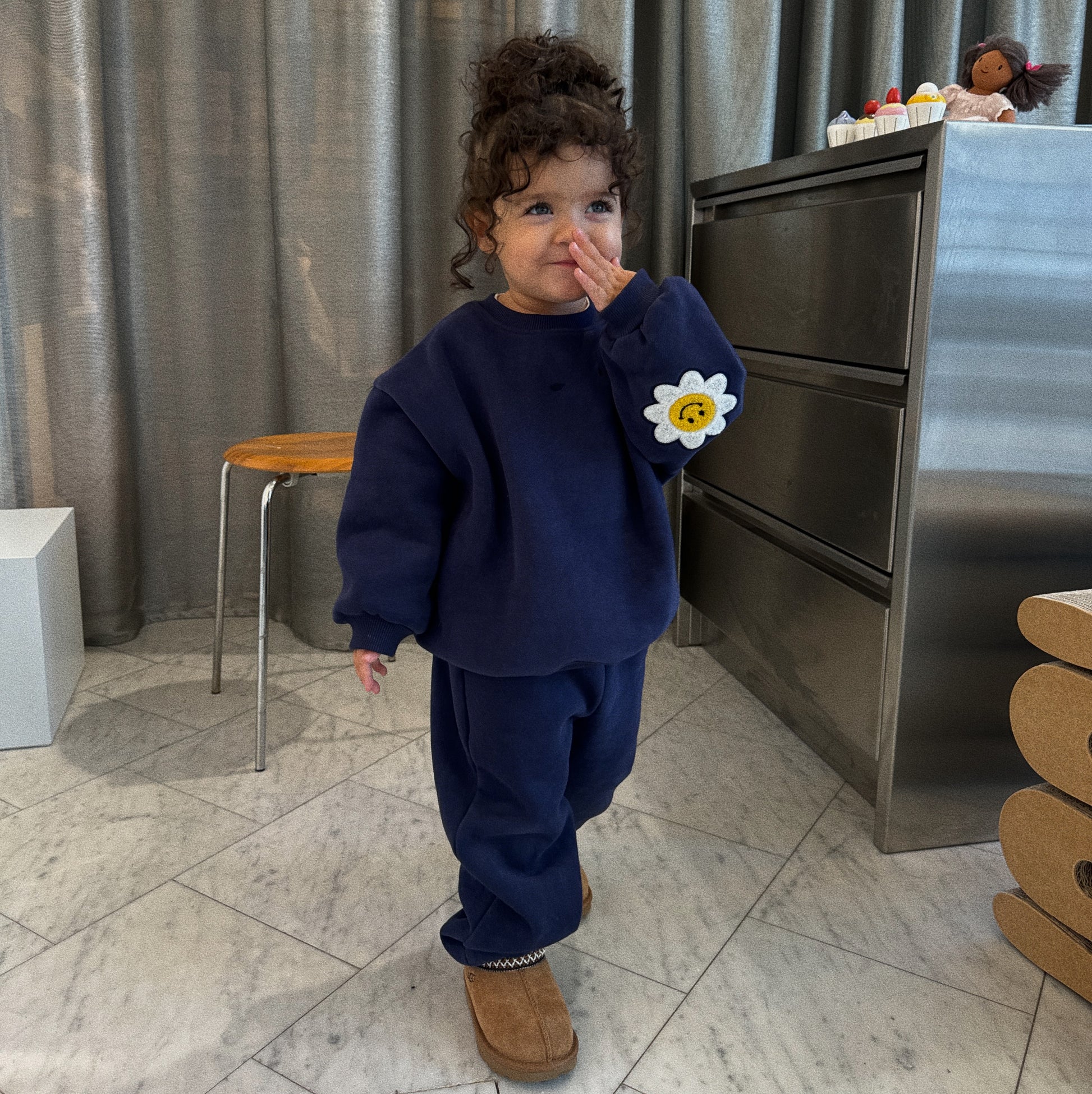 Flora in the navy set is 2.5 years old and is wearing size M.